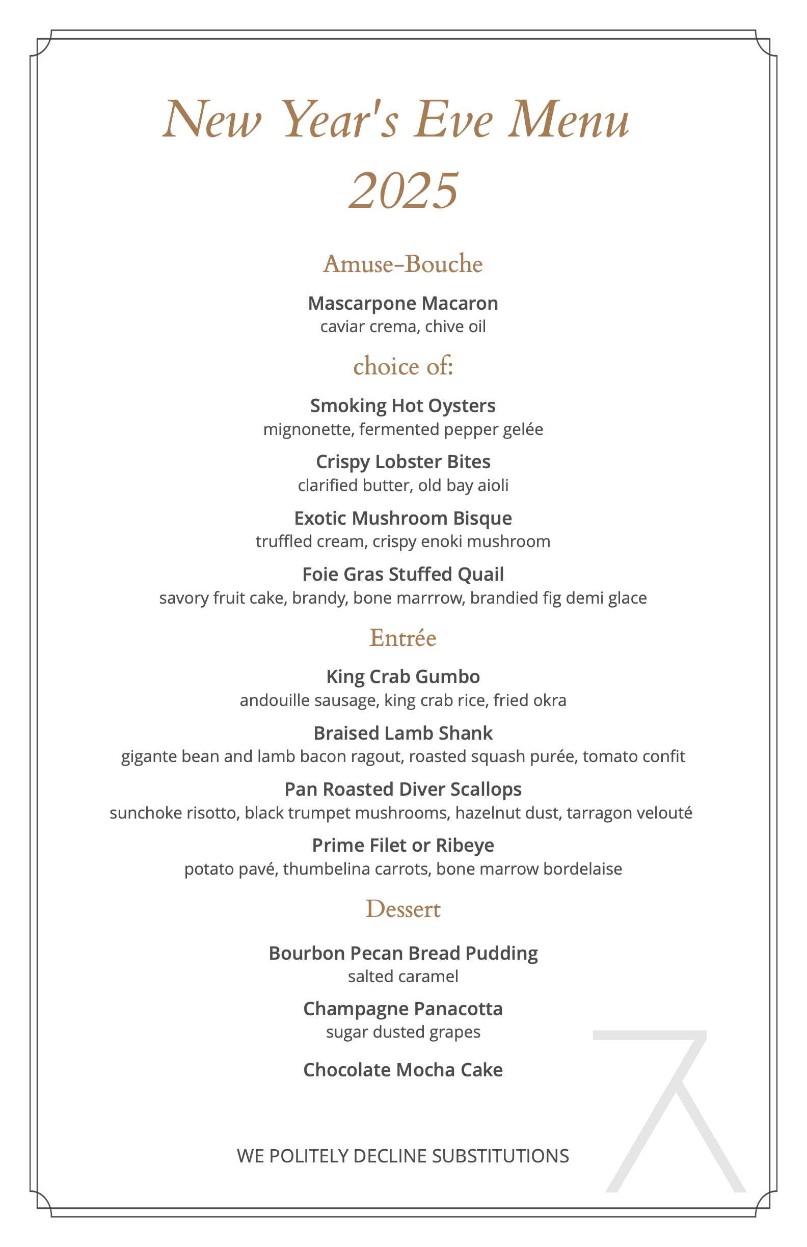 Ring in the New Year with a refined and festive dining experience featuring our $150 New Year’s Eve prix fixe menu, crafted to celebrate the final evening of the year in style. Enjoy a thoughtfully composed multi-course dinner showcasing standout seasonal flavors and signature dishes in an elegant setting. Tax and gratuity are not included and will be added to each bill. Reservations are required—please call 505-365-1010 to reserve your table and welcome the New Year with us.